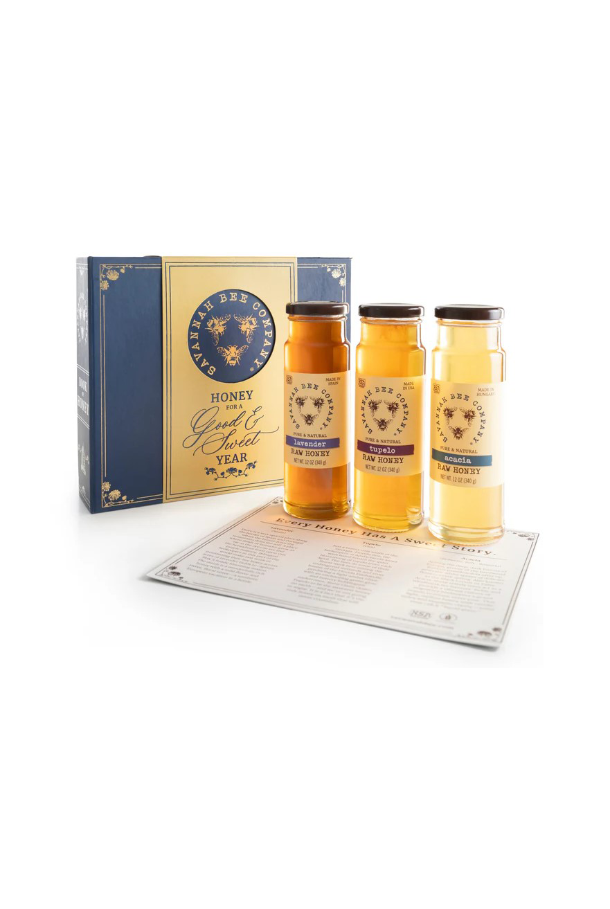 Celebrate a Good and Sweet New Year with a special twist on tradition: This exquisite edition of our Book of Honey presents a trio of our most popular 12 ounce honey jars—Lavender, Tupelo and Acacia—to bring awe to all of your days. A perfect gift for Rosh Hashanah or any divine occasion.