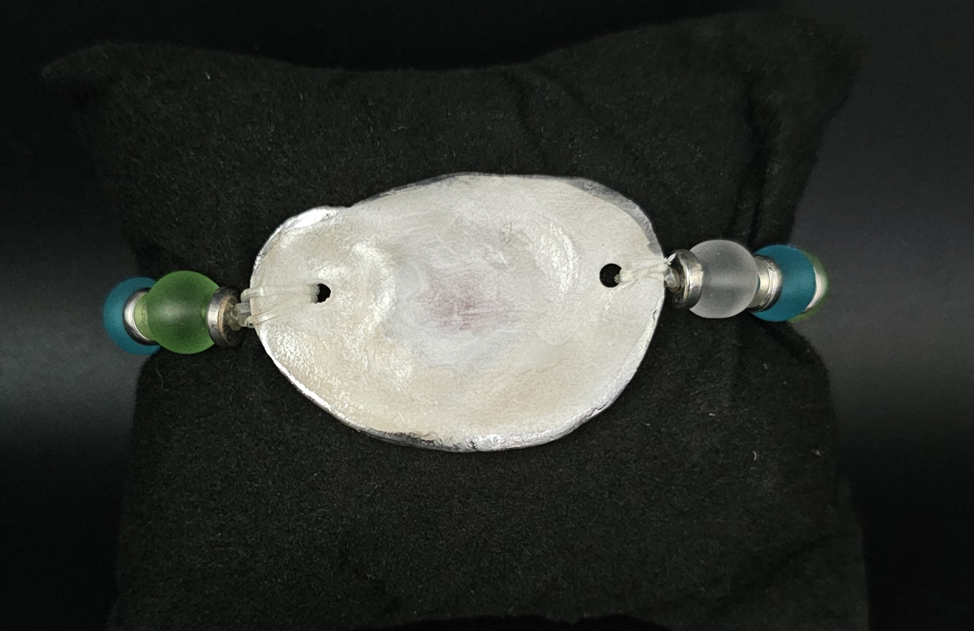 This natural oyster shell bracelet features stunning sea glass beads in ocean-inspired hues, offering a perfect blend of coastal charm and elegance. A versatile accessory for any occasion, it captures the essence of seaside beauty.
